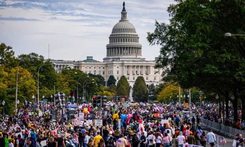 Millions of people nationwide marched on Saturday in protests of Trump administration moves they see as undermining democracy. In an early survey, sociologists found that 59 percent of protesters in Washington D.C. reported disagreement with political violence, in a turn from similar surveys at previous protests.